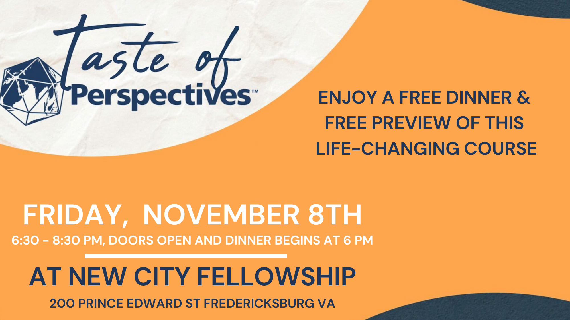 A Taste of Perspectives is our pre-launch event to give you a sneak peek of the in-depth content we will be studying together this winter. Join us for an evening with food, friends, and some fast-paced sessions all about God's global purpose for each one of us! Come expecting and leave inspired!